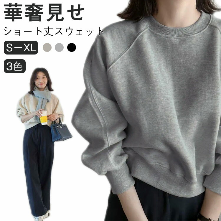 ショート丈スウェット【送料無料】トップス レディース スウェット プルオーバー 長袖 ショート丈 オーバーサイズ ボリューム袖 ドロップショルダー 着心地良い リラックス シンプル おしゃれ ゆったり 体型カバー 着回し ロングシーズン 黒 ブラック グレー 春 秋 冬