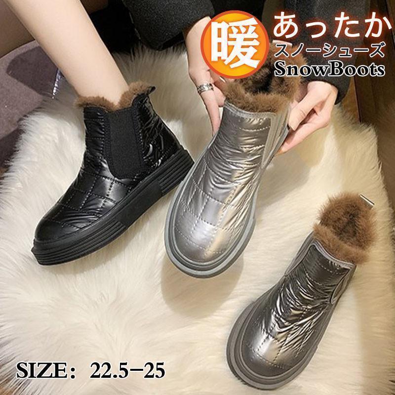 【期間限定10%OFF】スノーブーツ レディース ムートンブーツ 裏ボア 裏起毛 スリッポン サイドゴア ファー 厚底 ぺたんこ 防寒 光沢感 暖か 冬靴 可愛い 高級感