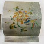 美品 名古屋帯 優品 草花 灰緑 正絹 中古