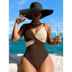 上下共インナーと一体化した露出控えめ水着。落ち着きカラーが◎ ネックリボン ショーツ一体型パンツ レディース水着 女性 おしゃれ めくれづらい 水陸両用 ウエスト調節【関連キー...