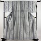 美品 紬 身丈159.5cm 裄丈66cm M 袷 やまと 証紙あり フクロウ 縦縞 灰色 正絹 逸品 中古