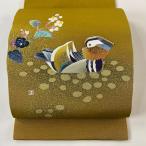 名古屋帯 逸品 羽田登喜 落款あり 鴛鴦 草花 金銀彩 黄土色 正絹 中古