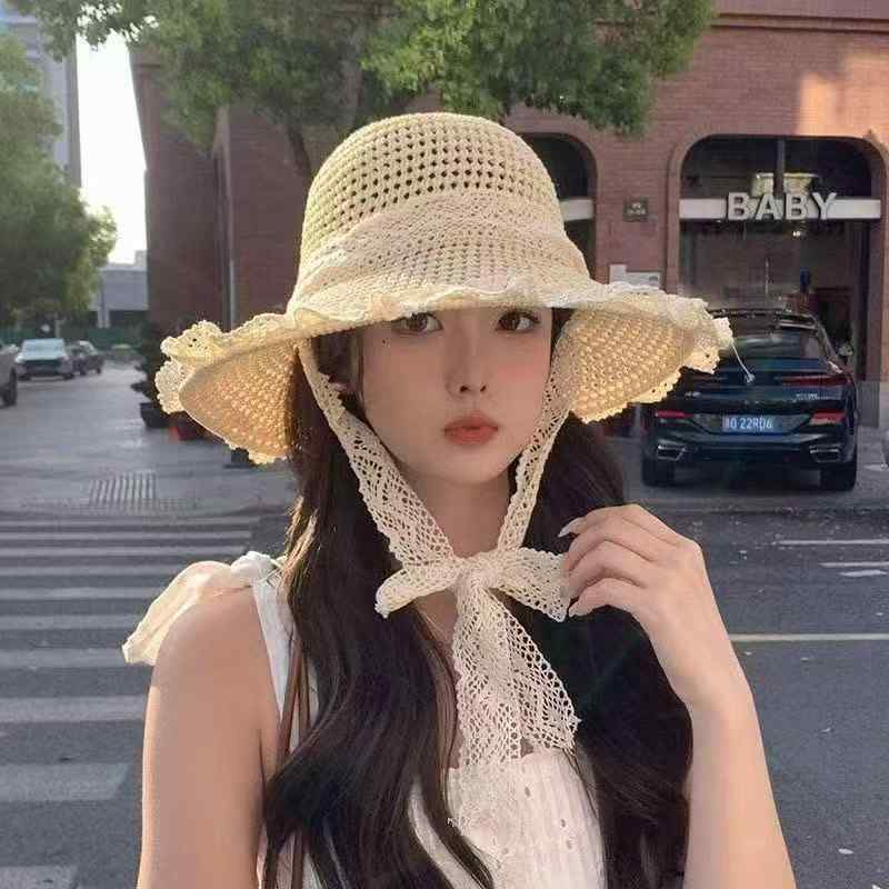 麦わら帽子 レディース 春夏 ラフィア レース 花柄 ビーチ帽子 つば広 ハット 日焼け防止 ベージュ 通気性 遮光 紫外線対策(x500)