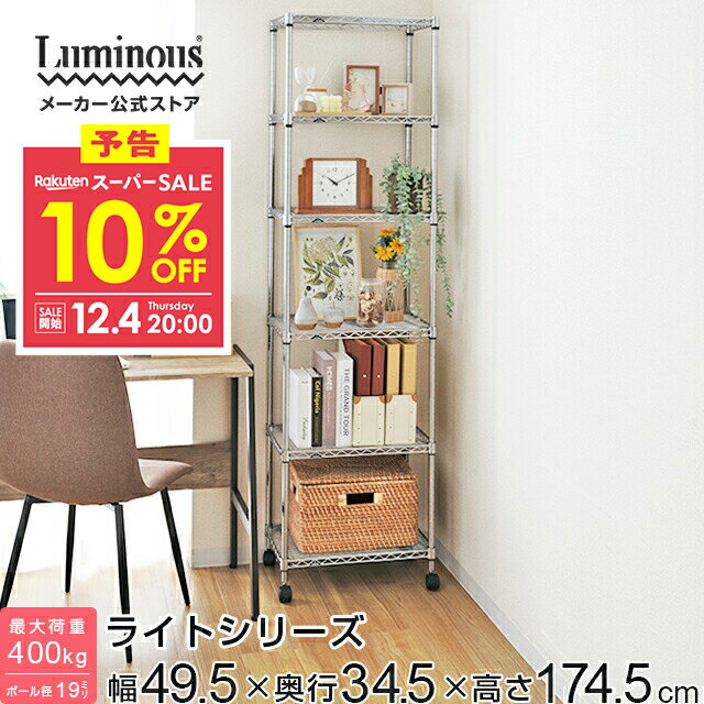 予告★12/4 20:00より★10%OFF★ ラック スチールラック 幅50 奥行35 6段 スリム 隙間 すき間 収納 棚 キャスター おしゃれ 省スペース キッチン収納 本棚 オープンラック レンジラック 玄関 ルミナスライト ポール径19mm 防災用品 防災 防災収納 備蓄 ストック IHT5018-6