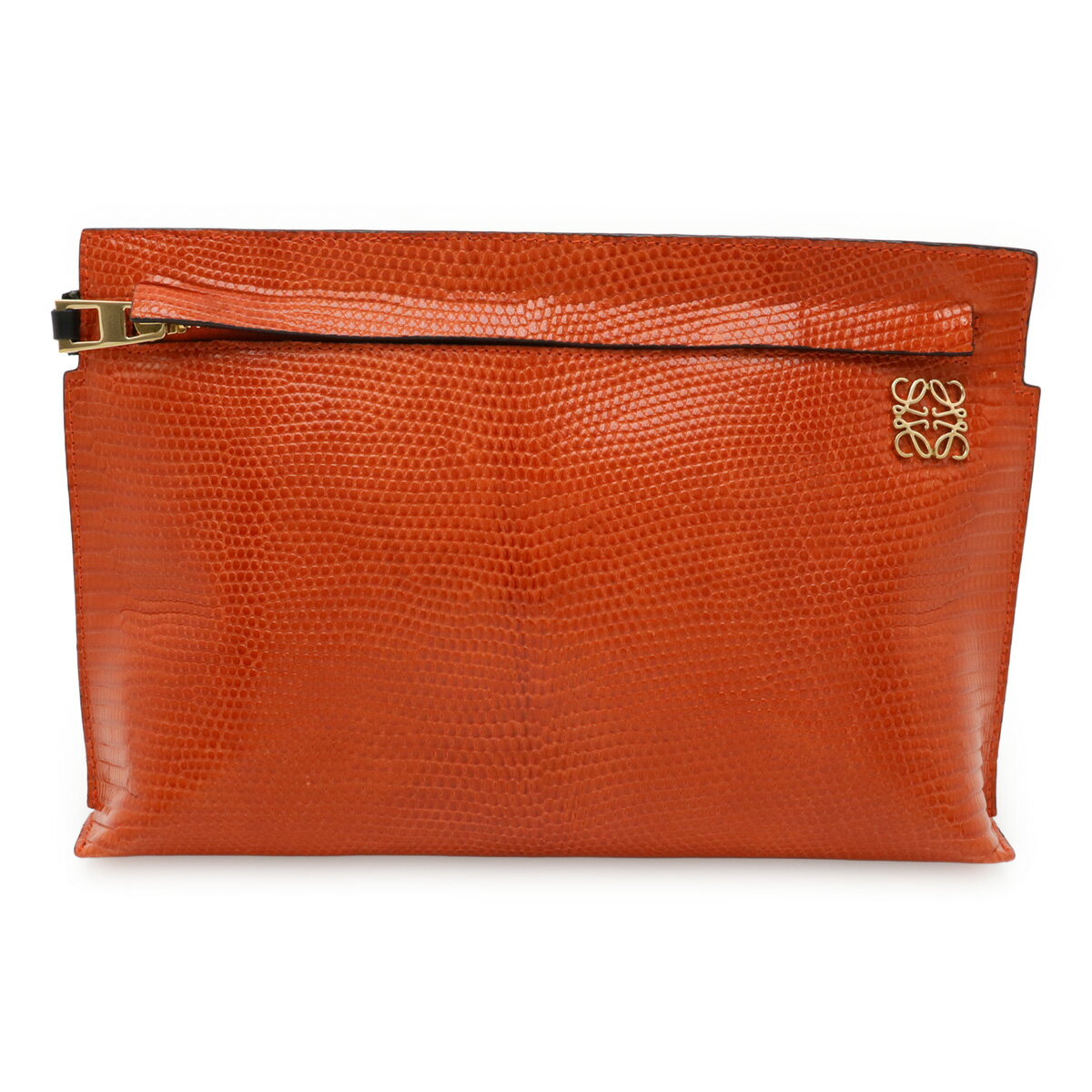 LOEWE ロエベ Tポーチ アナグラム クラッチバッグ セカンドバッグ マルチポーチ 小物入れ リザード レザー オレンジ ゴールド金具 【中古】
