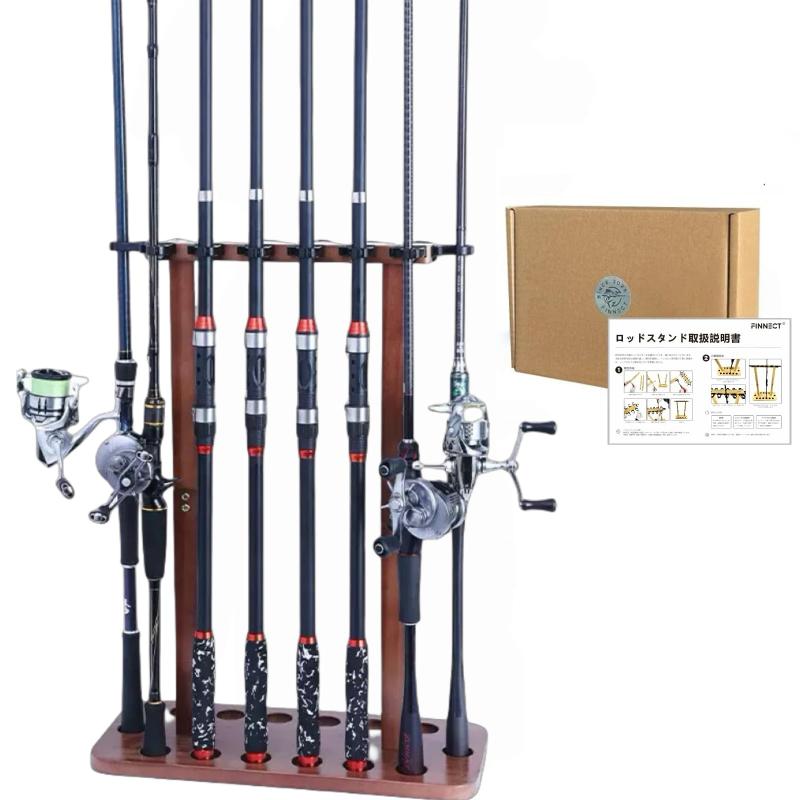 FINNECT 木製ロッドスタンド 8/14本 【ワンタッチで簡単収納・日本語取説付き】組立式 天然木 8/14本立て竿収納 釣り道具収納 ロッド収納 取扱簡単 無垢色/ウォールナット色