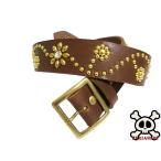 真鍮製バックル 栃木レザー フラワー型スタッズベルト チョコ クリスタルスポッツ 日本製 一枚革ベルト