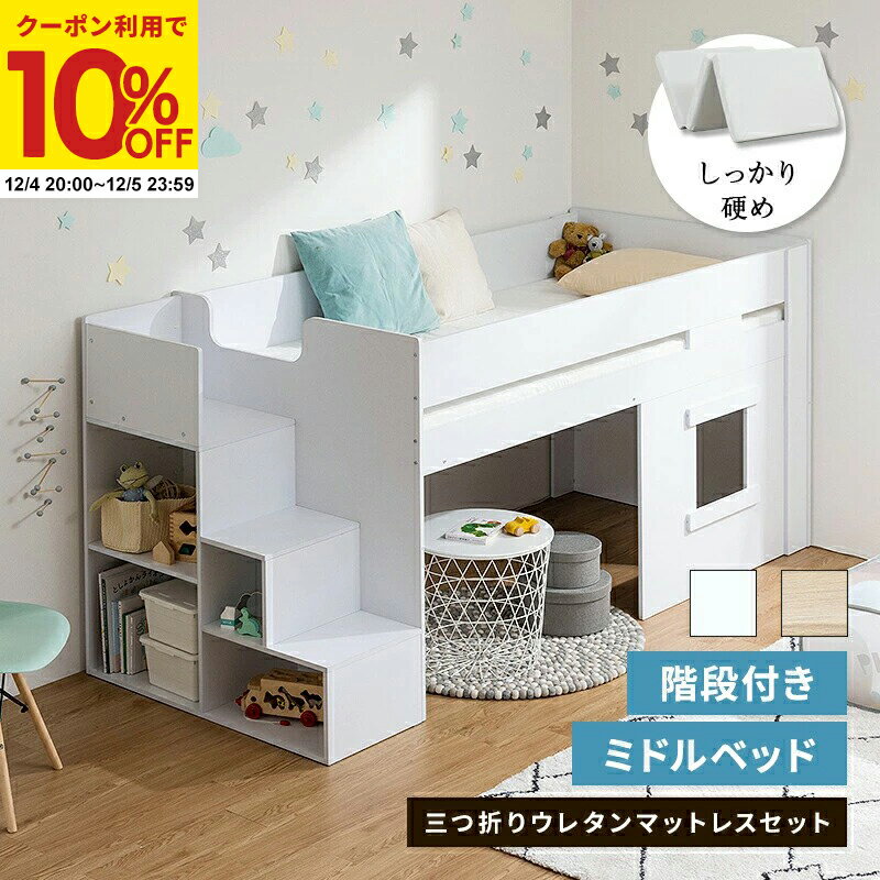 【クーポンで10%OFF★12/5 23:59まで】 階段付き ロフトベッド ロータイプ ミドルベッド 木製 システムベッド 階段 シングル 北欧 風 ロフト ベッド 子供部屋 収納 フレーム 子供 キッズ 一人暮らし 寮 ゲストハウス 民泊 ナチュラル ホワイト