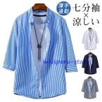 シャツ メンズ 七分袖 半袖 夏服 ストライプ柄 ワイシャツ カジュアルシャツ 開襟シャツ おしゃれ ビジネス 通勤 通学 ゆったり トップス 父の日