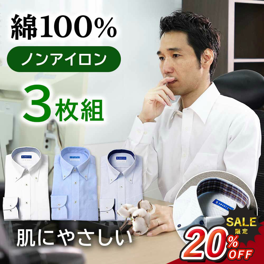 【スーパーSALE20%OFF】 【綿100%なのにノーアイロン】 ワイシャツ 3枚 セット 綿100% ノーアイロン メンズ ワイシャツ長袖 超形態安定 標準体 長袖ワイシャツ ノンアイロン 白 青 ホワイト カッターシャツ ビジネス 結婚式 仕事
