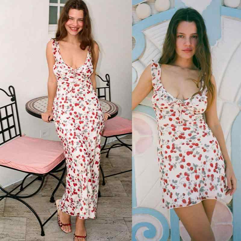 レディース ワンピース キャミソール シルク シフォン フリルエッジ ロマンティック イチゴ柄 夏用 ロング丈 ショート丈 軽やか 女性らしい シルエット