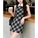 ワンピース 襟付きチェック柄ノースリーブミニワンピース