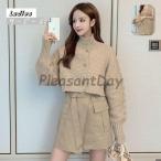 ノースリーブワンピース カーディガン ショート丈 長袖 ツーピース 前開き 前ボタン タートルネック ミニスカート 腰ベルト タイト スリム おしゃれ