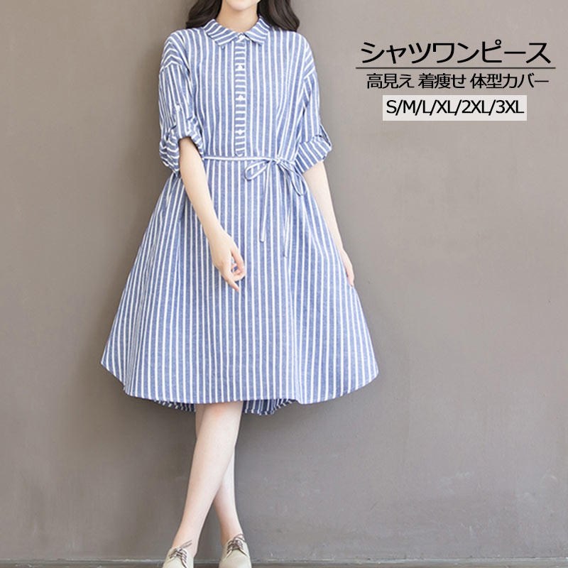 シャツワンピース 長そで レディース ロングワンピ Aライン ワンピース ウエスト紐 フレアワンピース 体型カバー ストライプ ショートレギュラー シャツロングワンピース アウタドア 重ね着 マキシ 長袖 オシャレ カジュアル 送料無料