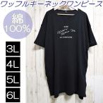 ワンピース チュニック 大きいサイズ ワッフル キーネック ひざ丈ワンピース 半袖 ワンピ ワッフル生地 ブラック 送料無料