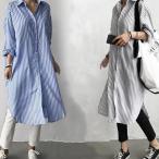レディース シャツワンピース ロングシャツ キャミソールおまけ ワンピース ミディアム丈 長袖 シャツ スリット入り チュニック ストライプ シャツワンピ