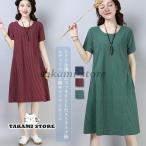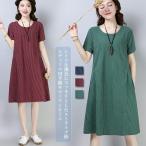 春 夏 ワンピース 半袖 レディース サマーワンピース ストライプ柄 半袖ワンピース ミディアム丈 クルーネック 夏ワンピース レトロ 膝丈ワンピース