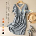 綿ワンピース 半袖 レディース 夏服 膝丈ワンピース ミディアム丈 フレア aライン vネック シャツワンピース リネン 綿麻 ドロスト リボン付き 30代40代50代