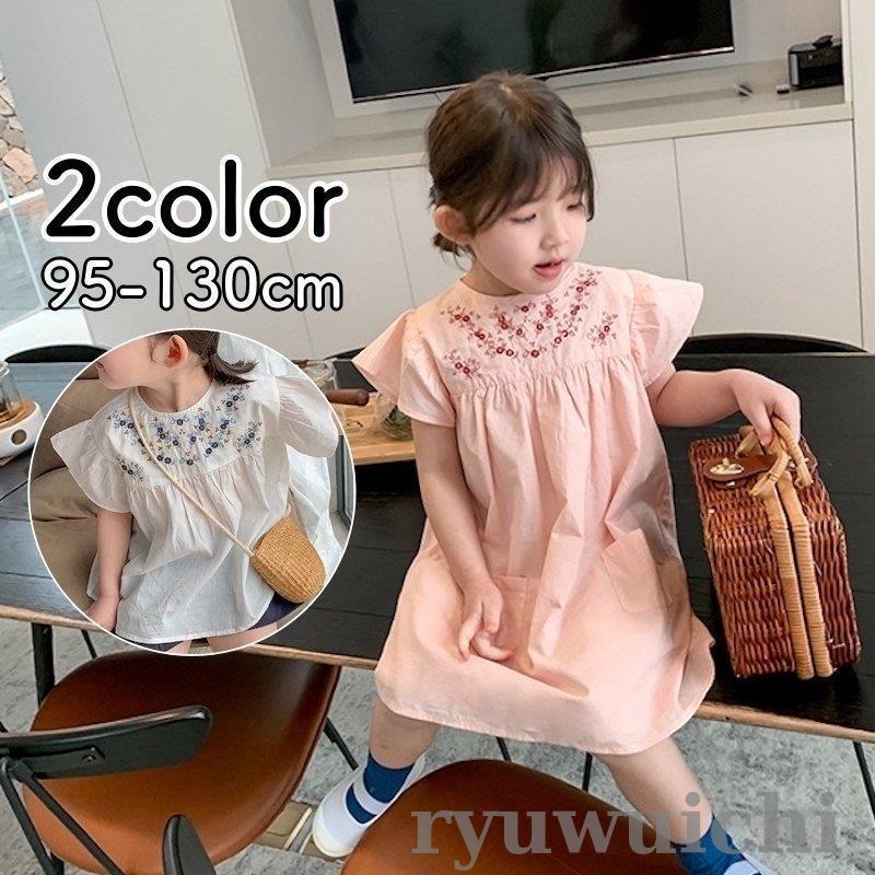【期間限定10%OFF】ワンピース 半袖 子供服 女の子 キッズ 花 刺繍 膝丈 Aライン 後開き 丸首 ラウンドネック 春 夏 ポケット付き プルオーバー ミディアム丈 ゆ