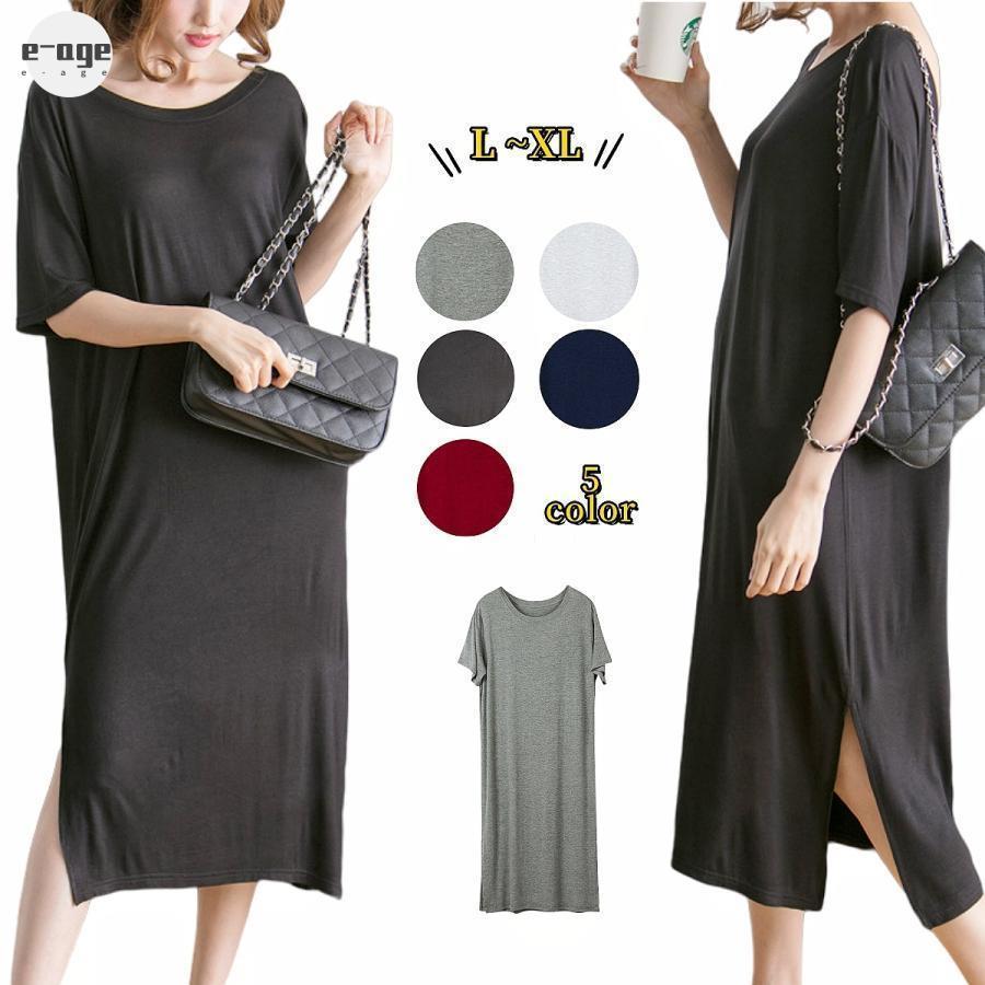【期間限定10%OFF】ワンピース ミディアム丈 半袖 レディース 女性 婦人 クルーネック スリット入り 大きいサイズ ラフ ゆったり 膝下丈 単色 無地 Aライン フレア