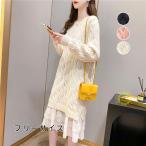 レディース 秋冬長袖 ニット無地ワンピース ミディアムスカート セーター ケーブル編み ニットレースパッチワーク 長袖 ニット ゆったりraimu