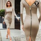 ワンピース 長袖 膝丈 タイト バックファスナー レディース ミディアム丈 ミディ丈 バックスリット スレンダー タイトスカート ジッパー