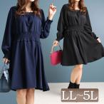 大きいサイズ レディース ワンピース スクエアネックワンピース ワンピ 長袖ワンピース 長袖 膝丈 ミディアム スクエアネック ドット パール ボリューム袖 シャーリング ウエストゴム 柄 フレア 秋新作 秋服 春服 LL 2L 3L 4L 5L ネイビー ブラック 黒 ゴールドジャパン