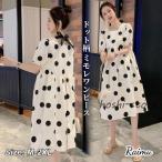 フレアワンピース レディース ワンピース 半袖 ドット柄 ミモレワンピース ミディアムワンピース フレア ハイウエスト ゆったり マタニティ