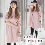 Tシャツワンピース ミディアム丈 五分袖 レディース クルーネック 無地 ピンク 膝丈 ひざ丈 体型カバー サイドスリット カジュアル 可愛い おしゃ