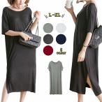 ワンピース レディース ロング丈 マキシ丈 ミディアム パッド付 カップ付き 半袖 長袖 ラウンドネック 無地 ゆったり ゆとり ゆるい シンプル