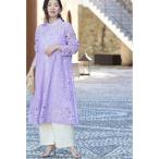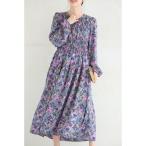 ワンピース 凛と咲く紫花シャーリングミディアムワンピース ロング丈