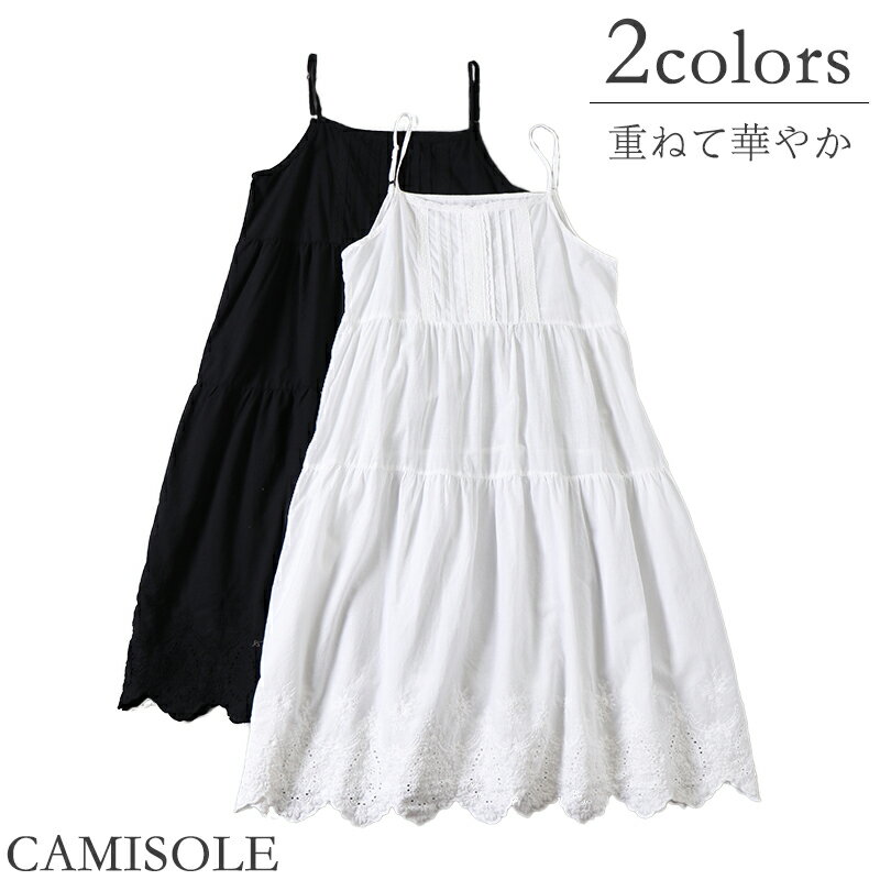 キャミソール ワンピース レディース レース 重ね着 レイヤード ロング丈 ペチワンピ 綿 コットン ノースリーブ 快適 インナー 下着 春 夏 フリーサイズ キャミワンピース 体型カバー シンプル ホワイト 白 黒 ブラック 刺繍 送料無料