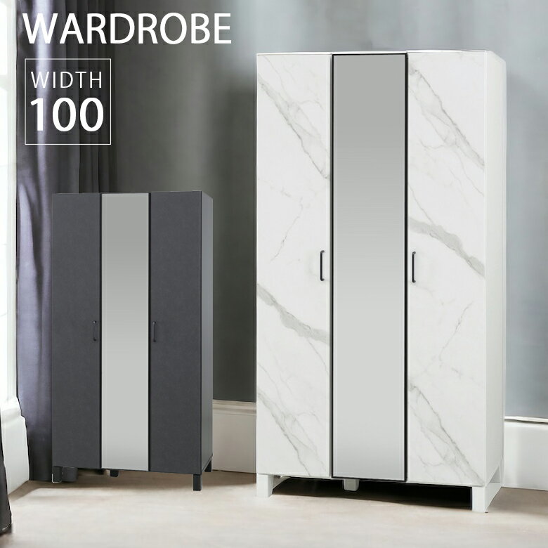 【全商品に使える10%offクーポンあり!!】 ワードローブ 引き出収納 100cm幅 収納 幅100cm クローゼット 服吊り シンプル おしゃれ 洋服収納 全身鏡 脚付き スライドレール フルオープンレール タンス 箪笥 セラミック柄 石目柄 木脚 ラバーウッド ホワイト