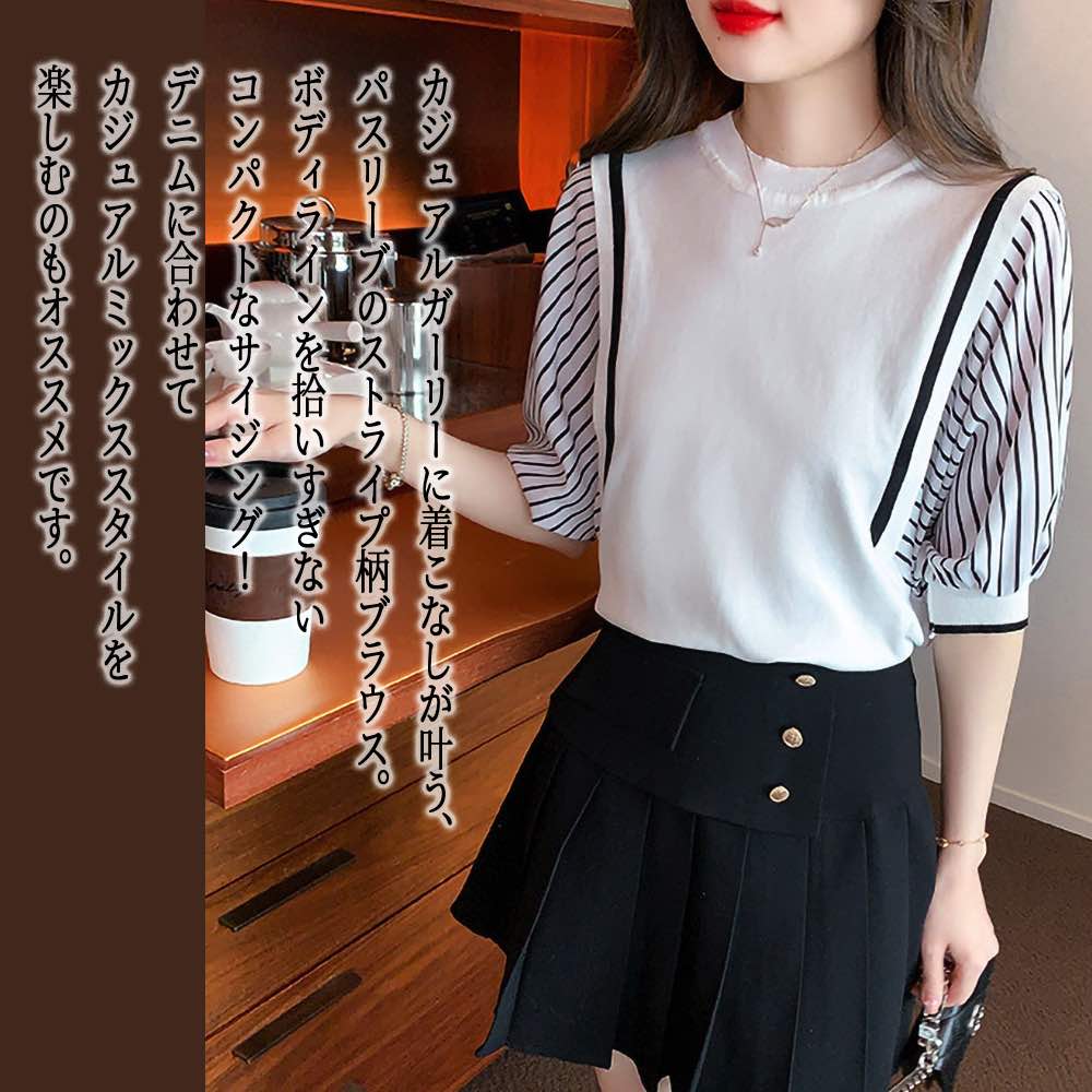 【\クーポン利用で20%OFF!/】 ブラウス レディース パフスリーブストライプブラウス 春 おしゃれ フォーマル カットソー カジュアル レース オフィス 半袖 白 シャツ リボン 事務服 Tシャツ 涼しい 大きいサイズ フリル 安い 人気 薄手 夏 スーツ ノーアイロン 50代