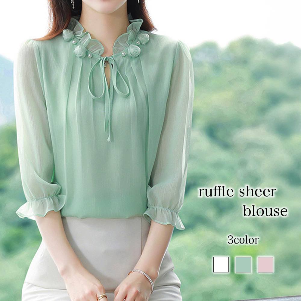 ブラウス レディース フリルシアーブラウス カジュアル レース シャツ Tシャツ 安い 50代 オフィス 涼しい 高品質 カットソー ブランド 事務服 大きいサイズ リボン 薄手 夏 シフォン きれいめ ノーアイロン フリル スーツ おしゃれ 人気 春 半袖 白 フォーマル