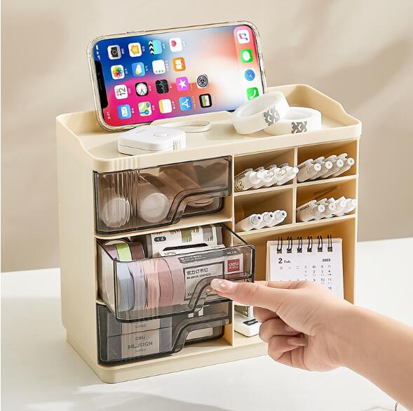 デスクオーガナイザー 卓上収納ボックス ペン立て 小物入れ 引き出し 組立不要 大容量 多機能 仕切り 事務用品 文房具 オフィス収納 化粧品収納 デスク上置き棚 机上収納ケース 卓上ラック 机上用品 整理整頓 ホワイト おしゃれ
