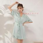 パジャマ ルームウェア レース切替 サテン ランジェリー 下着 レディース 2点セット前開き ガウン+キャミワンピース 春夏 薄手 部屋着