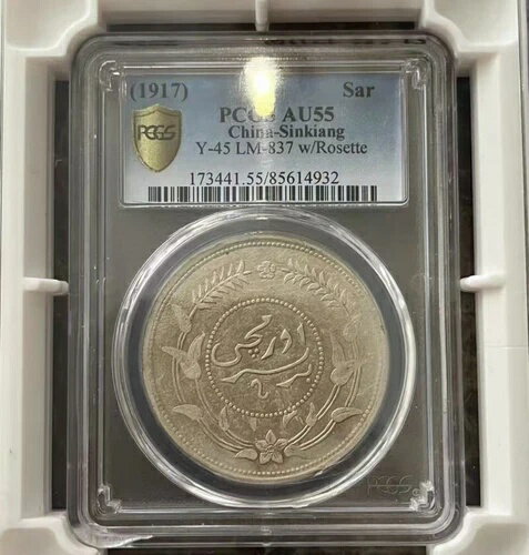 レア 1917 中国 新疆 1 サール シルバー コイン PCGS AU55 Y-45 LM-837 ロゼット付き