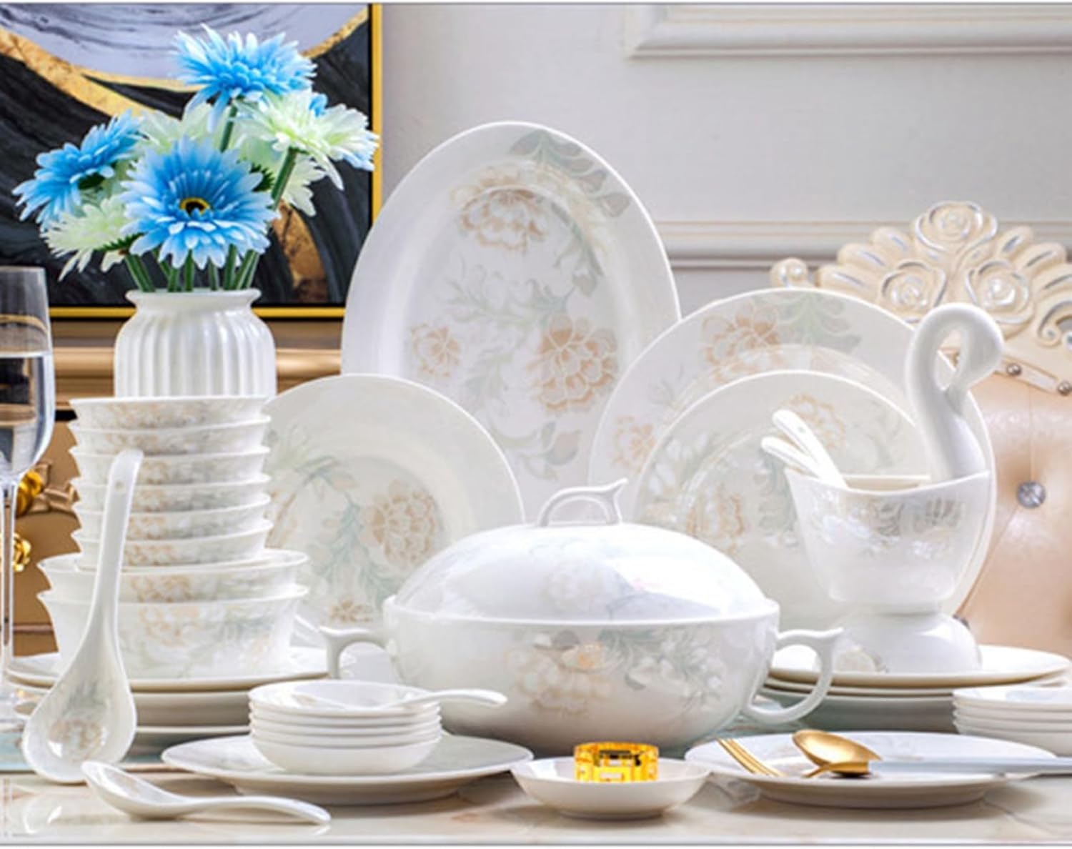 食器セット 10人食 60点セット ボーンチャイナ 牡丹花柄 白い磁器 ブルー 描金 碗セット お皿セット 丼 どんぶり 味噌汁碗 深皿 魚皿 プレート エレガント 陶器 中華 小皿 ソース/調味料皿