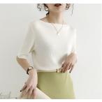 五分袖 ボートネック リブニット カットソー 春 夏 レディース オシャレ シンプル トップス サマーニット フリーサイズ