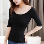 インナー襟ぐり広めレディース五分袖おしゃれカットソー可愛いかわいいシンプル無地春春服tシャツ黒白カジュアル