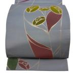 袋帯 逸品 辻村ジュサブロー 落款あり 関西仕立て 草花 箔 灰色 全通 正絹 中古