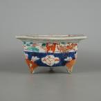 【中古】盆栽鉢 伊万里 小型 長辺 約 15.3cm 六角鉢 色絵 松 花 模様 観賞用 現品 中古鉢