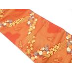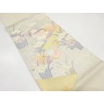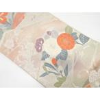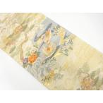 袋帯 名品 琳派歌仙献上文 八つ橋 花鳥 金銀糸 箔 薄オレンジ 六通 正絹 中古