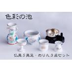 国産 5具足 仏具セット おりん3点セット ■ 色彩の池 ■ 仏壇 お供え ■ 香炉灰付 お盆 お彼岸 お墓参り 供養
