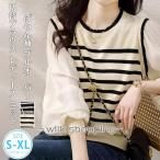 春秋冬 切替ブラウス ニット ボリューム袖 トップス 長袖Tシャツ カットソー 通勤 仕事 事務所 キレイめぽわん袖 プルオーバー パフスリーブ ボーダー