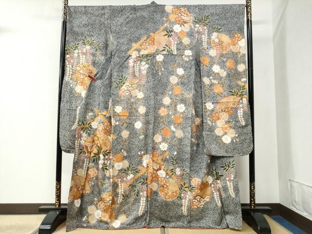平和屋着物●豪華振袖 駒刺繍 糸巻き吉祥枝垂れ花蝶文 たたき染め 黒地 金彩 正絹 逸品 CABC6404yc