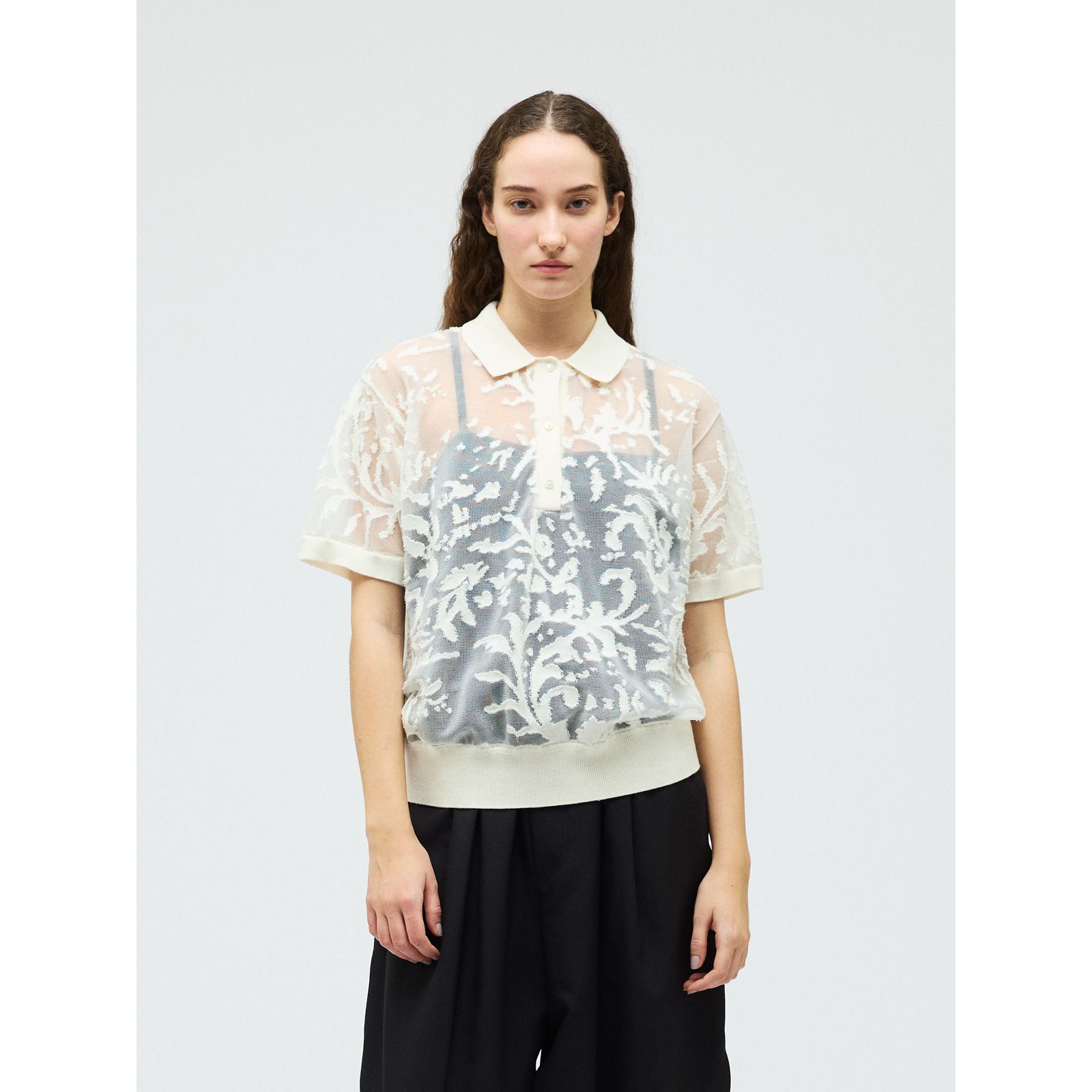 mizuiro ind(ミズイロインド)/メッシュ刺繍ポロプルオーバー