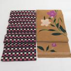 アンティーク 単衣帯 2本セット 正絹 市松 桔梗 茶色 紫色 織文様 レトロ