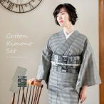 洗える着物 木綿着物と木綿名古屋帯の2点セット 「グレーグレンチェック+ナンバープレート」 サイズ M/L KIMONOMACHI オリジナル (メール便不可)